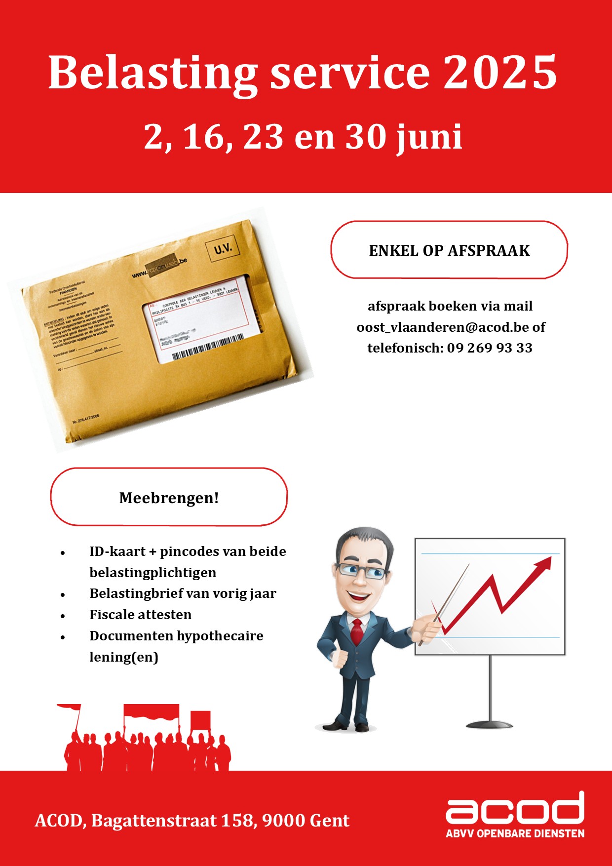 Een afspraak maken kan via mail naar oost_vlaanderen@acod.be of telefonisch op het nummer 09 269 93 33